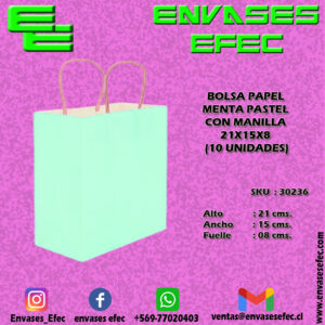 BOLSA PAPEL MENTA PASTEL CON MANILLA 21X15X8 (10 UNIDADES)