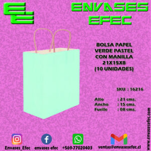 BOLSA PAPEL VERDE PASTEL CON MANILLA 21X15X8 (10 UNIDADES)