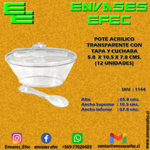 POTE ACRILICO TRANSPARENTE CON TAPA Y CUCHARA 5.8 X 10.5 X 7.8 CMS. (12 UNIDADES)