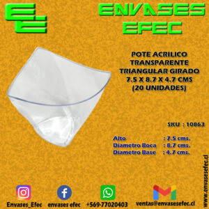 POTE ACRILICO TRANSPARENTE TRIANGULAR GIRADO 7.5 X 8.7 X 4.7 CMS (20 UNIDADES)