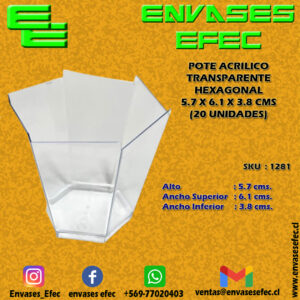POTE ACRILICO TRANSPARENTE HEXAGONAL 5.7 X 6.1 X 3.8 CMS (20 UNIDADES)