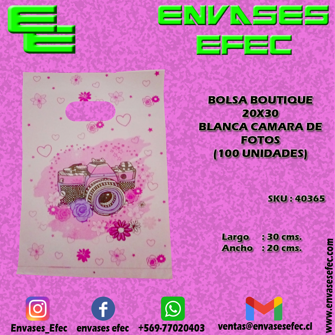 BOLSA BOUTIQUE 20X30 BLANCA CAMARA DE FOTOS (100 UNIDADES)