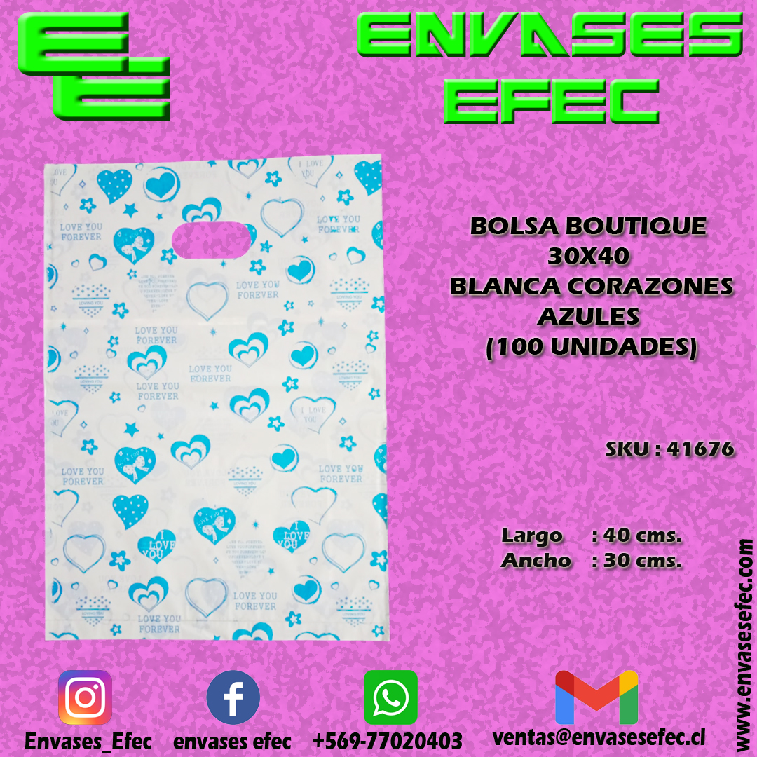 BOLSA BOUTIQUE 30X40 BLANCA CORAZONES AZULES (100 UNIDADES)