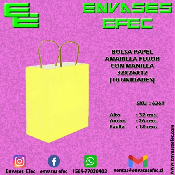 BOLSA PAPEL AMARILLA FLUOR CON MANILLA 32X26X12 (10 UNIDADES)