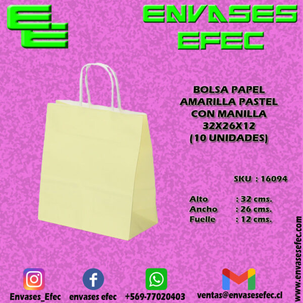 BOLSA PAPEL AMARILLA PASTEL CON MANILLA 32X26X12 (10 UNIDADES)