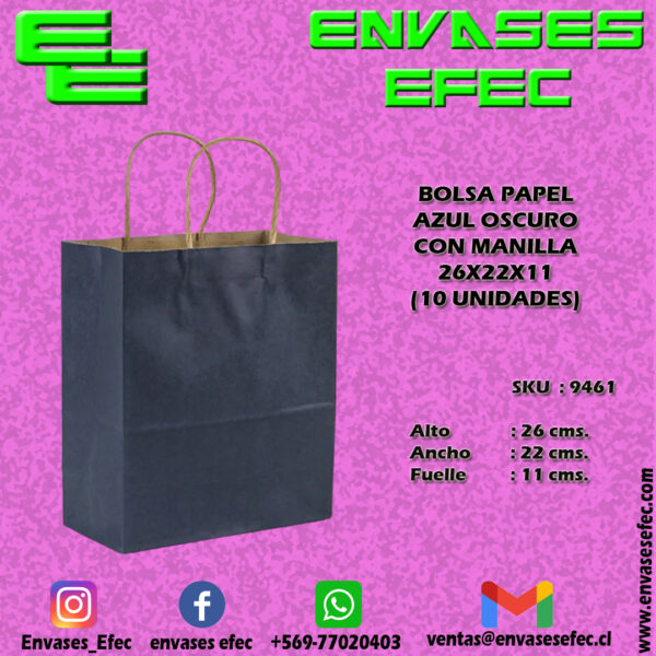 BOLSA PAPEL AZUL OSCURO CON MANILLA 26X22X11 (10 UNIDADES)