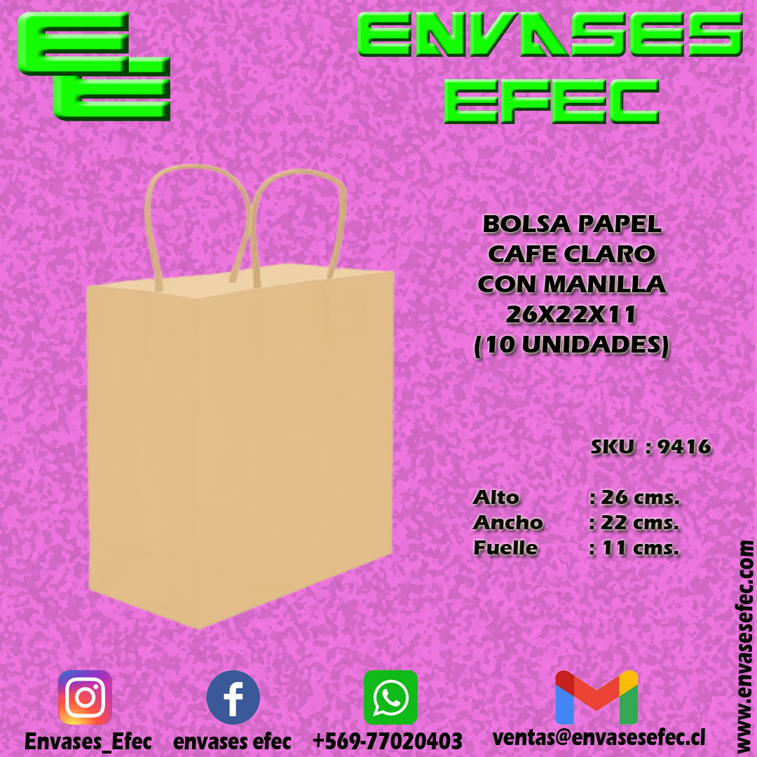 BOLSA PAPEL CAFE CLARO CON MANILLA 26X22X11 (10 UNIDADES)