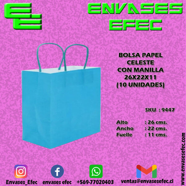 BOLSA PAPEL CELESTE CON MANILLA 26X22X11 (10 UNIDADES)