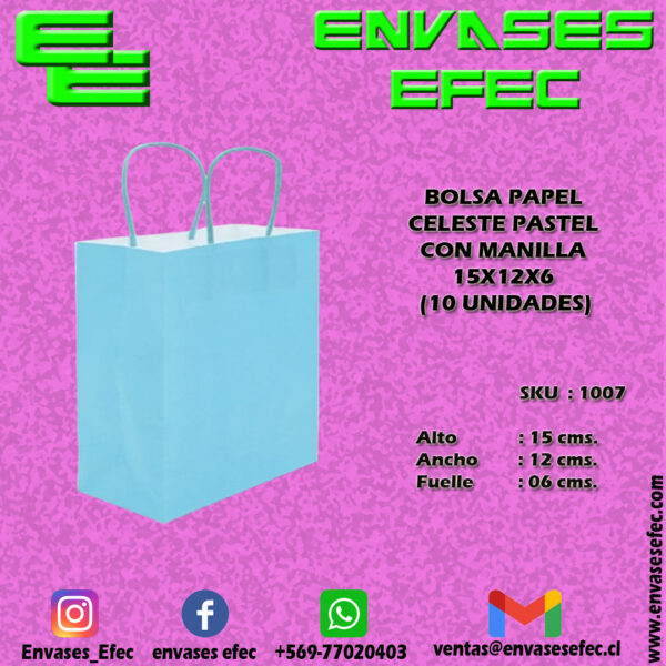 BOLSA PAPEL CELESTE PASTEL CON MANILLA 15X12X6 (10 UNIDADES)