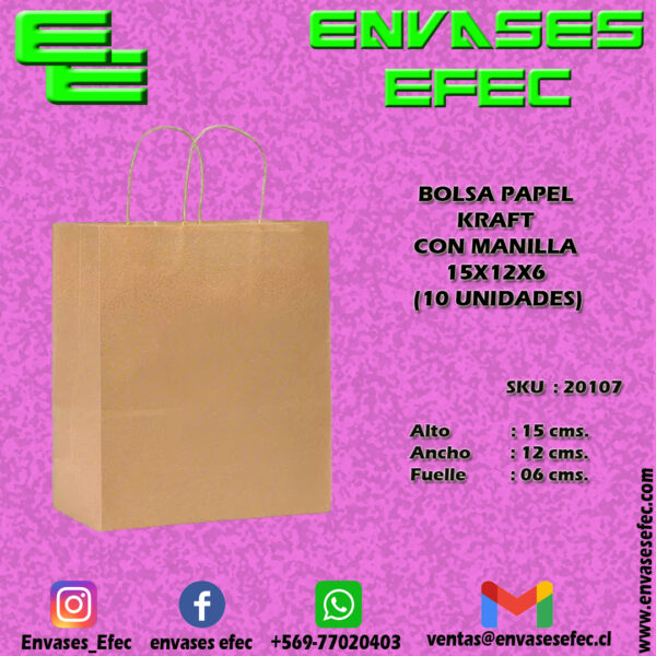 BOLSA PAPEL KRAFT CON MANILLA 15X12X6 (10 UNIDADES)