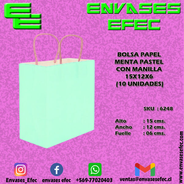 BOLSA PAPEL MENTA PASTEL CON MANILLA 15X12X6 (10 UNIDADES)