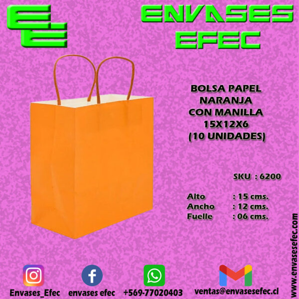 BOLSA PAPEL NARANJA CON MANILLA 15X12X6 (10 UNIDADES)