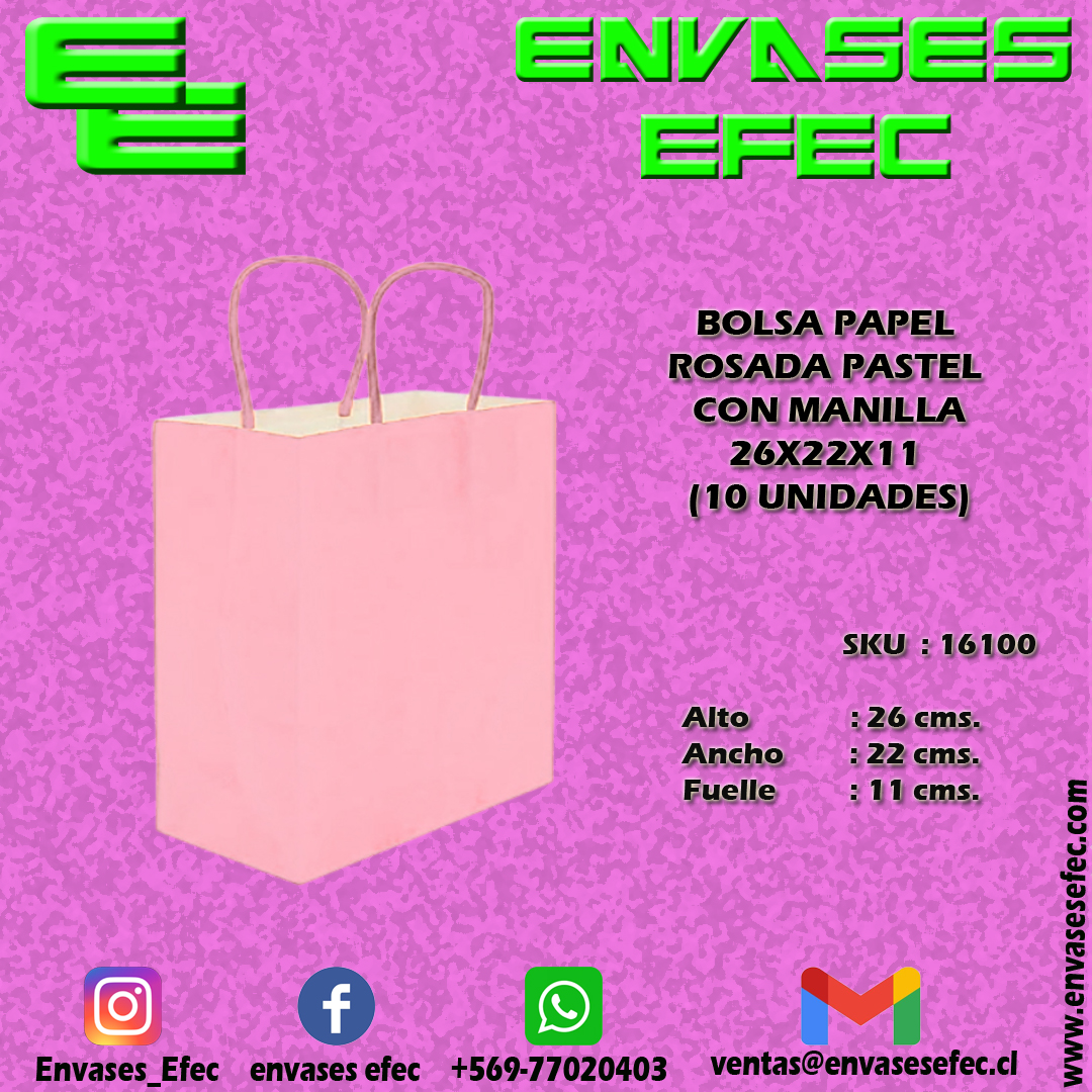 BOLSA PAPEL ROSADA PASTEL CON MANILLA 26X22X11 (10 UNIDADES)