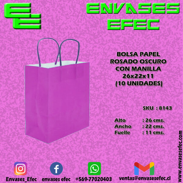 BOLSA PAPEL ROSADO OSCURO CON MANILLA 26X22X11 (10 UNIDADES)