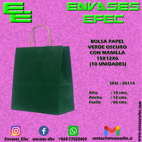 BOLSA PAPEL VERDE OSCURO CON MANILLA 15X12X6 (10 UNIDADES)
