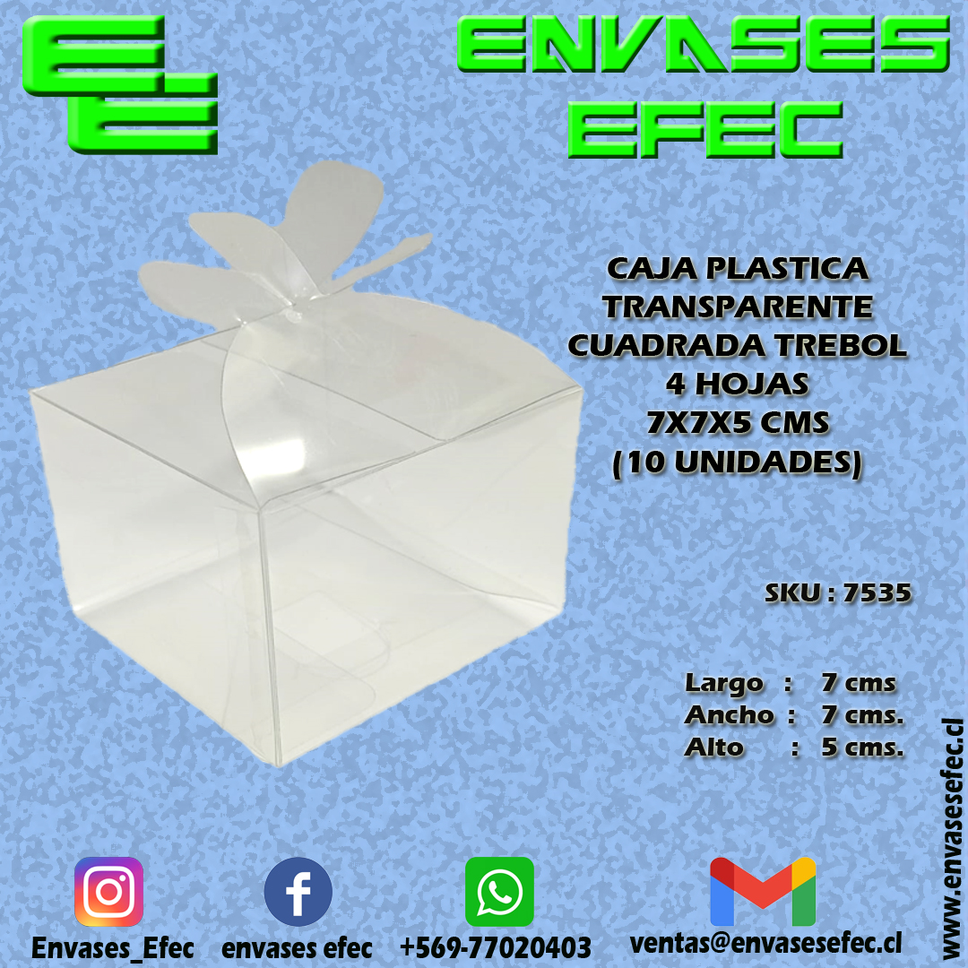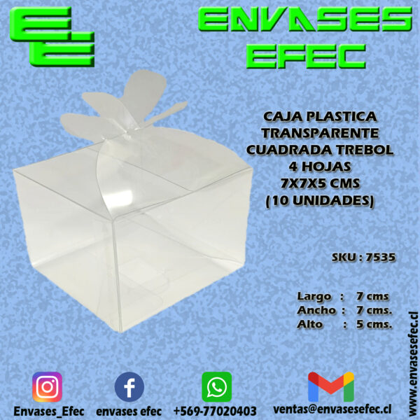 CAJA PLASTICA TRANSPARENTE CUADRADA TREBOL 4 HOJAS 7X7X5 CMS (10 UNIDADES)