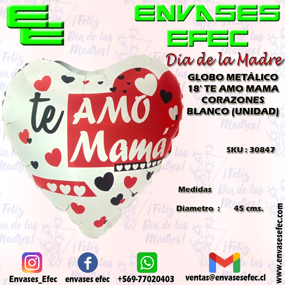 GLOBO METÁLICO 18′ TE AMO MAMA CORAZONES BLANCO (UNIDAD)