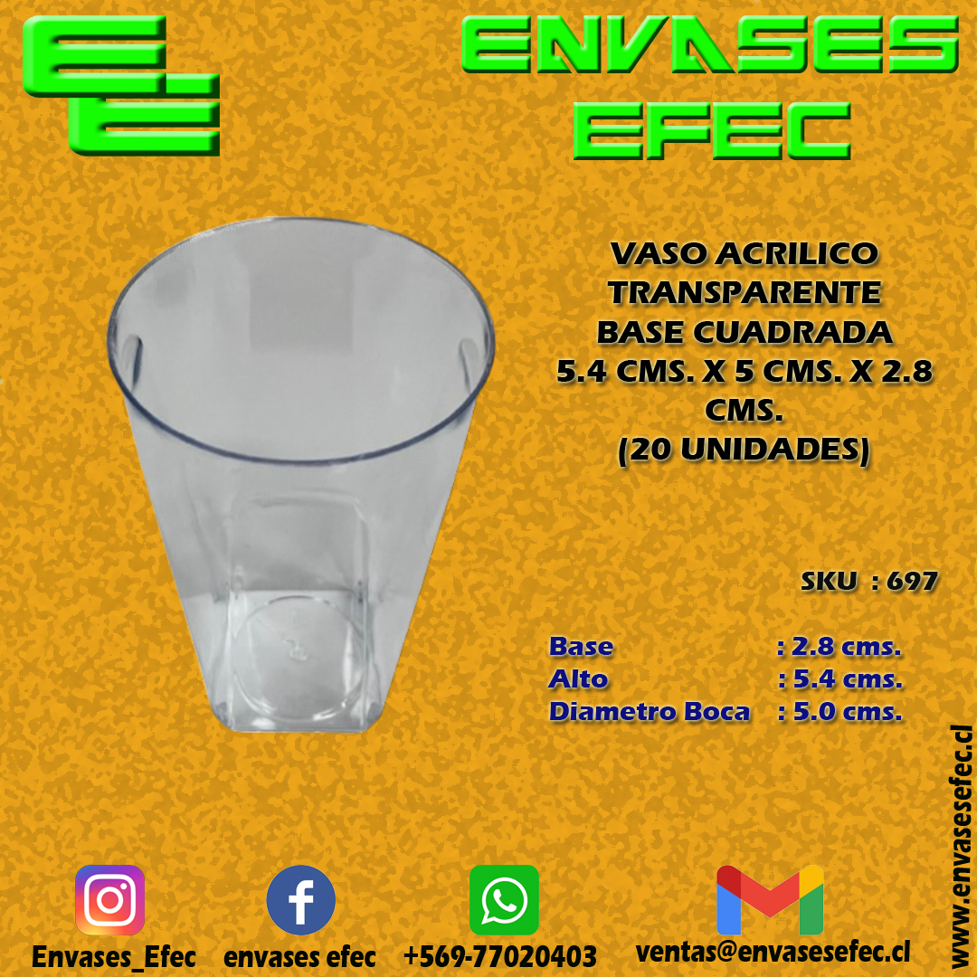 VASO ACRILICO TRANSPARENTE BASE CUADRADA 5.4 CMS. X 5 CMS. X 2.8 CMS. (20 UNIDADES)