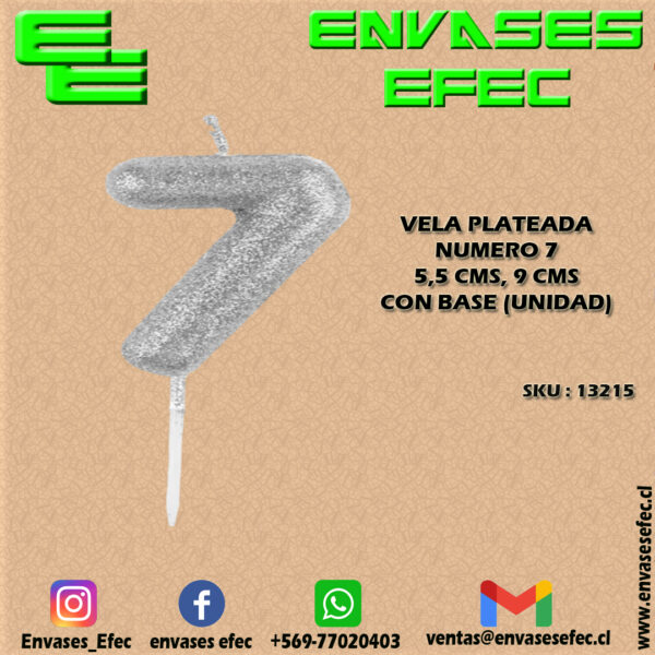 VELA PLATEADA NUMERO 7 – 5,5 CMS X 9 CMS CON BASE (UNIDAD)